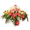 [材料]:大红掌7片、粉色百合、跳舞兰,粉玫瑰。 [包装]:讲台专用花泥底座,散尾叶,巴西叶搭配