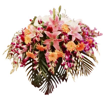 [材料]:橙色扶郎、粉色百合、洋兰,粉色勿忘我。 [包装]:讲台专用花泥底座,散尾叶,栀子叶搭配