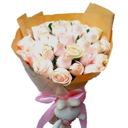 [材料]:29枝粉雪山玫瑰,1个卡通。 [包装]:牛皮纸圆面包装,粉色缎带装饰。