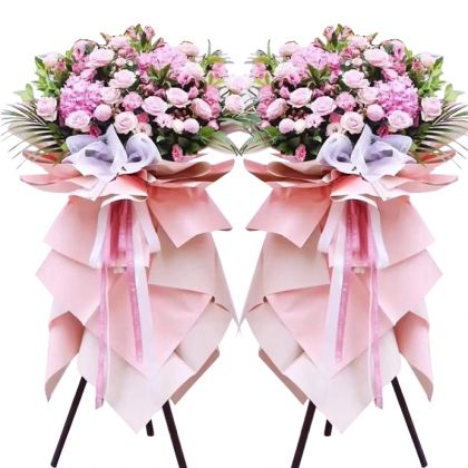 [材料]:粉雪山玫瑰20枝,绣球2枝,粉丝洋桔梗,红豆,水仙百合,散尾叶,栀子叶。 [包装]:木质三脚架,粉色雾面纸包装,精美制作。 [备注]:全国一二三线城市有货,请提前1-2天预定花篮较好。