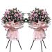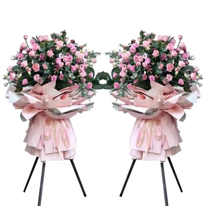 [材料]:戴安娜玫瑰35枝,多头玫瑰若干,洋桔梗,高山羊齿,龟背叶,栀子叶。 [包装]:木质三脚架,粉色雾面纸包装,精美制作。 [备注]:全国城市分店有货,请提前1-2天预定花篮较好。