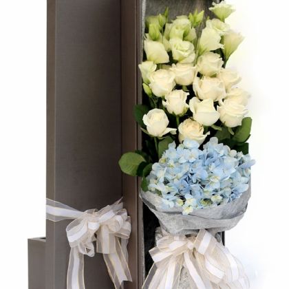[材料]:11枝香槟玫瑰,1把洋桔梗,绣球1枝。 [包装]:长形精品礼盒精致包装