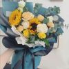 向日葵2枝,香槟玫瑰5枝,黄玫瑰2枝,白玫瑰2枝,桔梗,尤加利搭配,精美花束