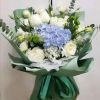绣球1枝,白玫瑰9枝,洋桔梗雏菊搭配,绿色琅青纸精美包装花束。