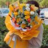 黄玫瑰11枝,橙色康乃馨8枝,洋桔梗,手球叶,尤加利搭配,黄色雾面纸精美花束。