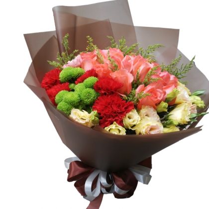 [材料]:19枝戴安娜玫瑰,红色康乃馨5枝,雏菊、黄英、洋桔梗搭配。 [包装]:咖啡色雾面纸圆形精