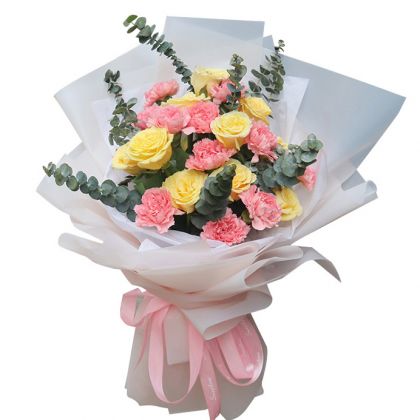 9朵黄玫瑰,11枝粉康乃馨,尤加利搭配。