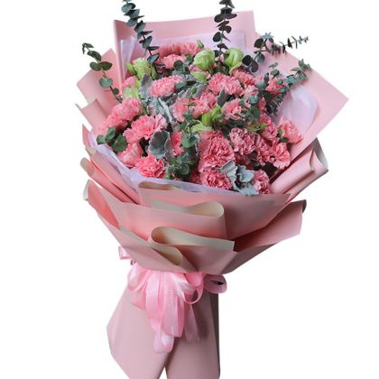 33枝粉色康乃馨,青桔梗,银叶菊,尤加利搭配。