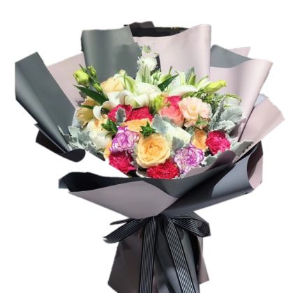 [材料]:9枝香槟玫瑰,6枝红康,多头香水百合1枝,银叶菊,洋桔梗搭配。