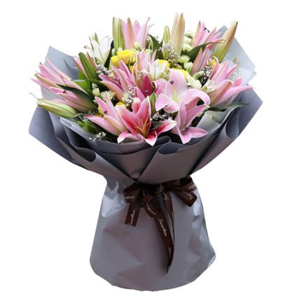 27朵粉百合,多头黄玫瑰,绿色多头康若干,满天星点缀。