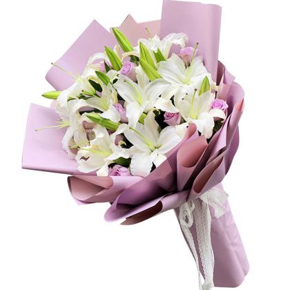 6枝白色多头香水百合,9枝紫玫瑰组合。