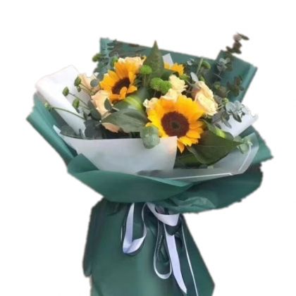6枝香槟玫瑰,3枝精选向日葵,尤加利,绿色雏菊。