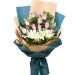 11枝戴安娜玫瑰,2枝多头白色香水百合,绿色小雏菊,栀子叶搭配。