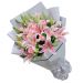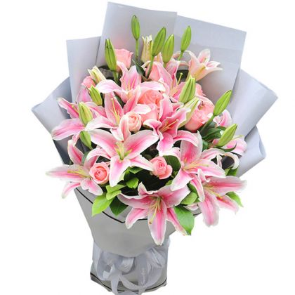 8枝多头粉百合,11枝戴安娜玫瑰,栀子叶搭配。