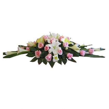 铁炮百合,白百合,戴安娜玫瑰。 [包装]:专用花泥底托,八角叶,巴西叶等搭配。