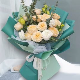 香槟玫瑰27枝,白色洋桔梗,尤加利搭配。自营 -
