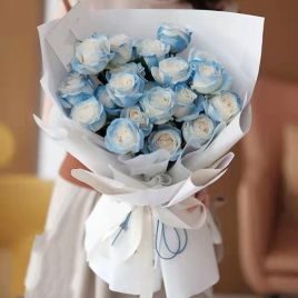 花材:碎冰蓝玫瑰11枝,白色蝴蝶兰1朵,蓝色蓬莱松,蓝色郁金香1枝,喷泉草,蓝星花搭配。 包装:蓝色自营 -