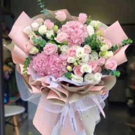 粉玫瑰9枝,蓝色绣球2枝,粉色小雏菊2枝,多头玫瑰1枝,非洲菊4枝,粉康乃馨3枝,白色洋桔梗,尤加利自营 -