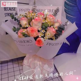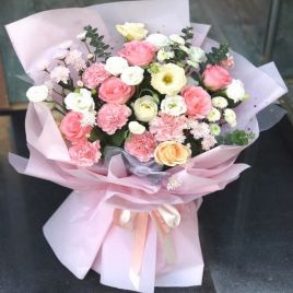 粉玫瑰5枝,香槟玫瑰1枝,白玫瑰1枝,粉康乃馨6枝,白色洋桔梗,粉小菊,白小菊,尤加利搭配自营 -