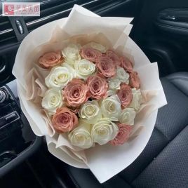 卡布奇诺玫瑰17枝,白玫瑰6枝,喷泉草洋甘菊搭配,驼色包装纸精美包装。自营 -