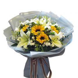 向日葵白玫瑰粉玫瑰多头玫瑰黄天霸百合雏菊紫罗兰澳梅红豆混搭花束 -