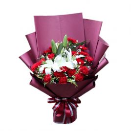 19枝红色康乃馨,2枝3头白百合,黄英搭配,白色满天星间插自营 -