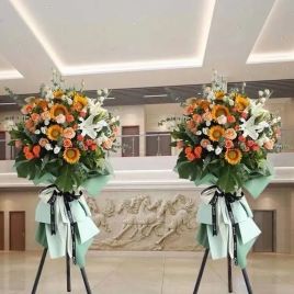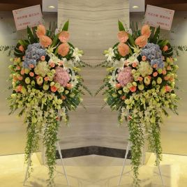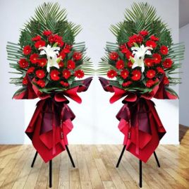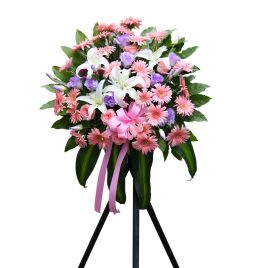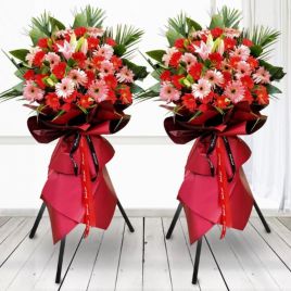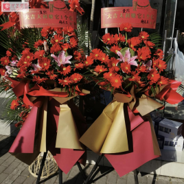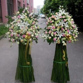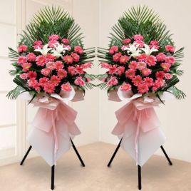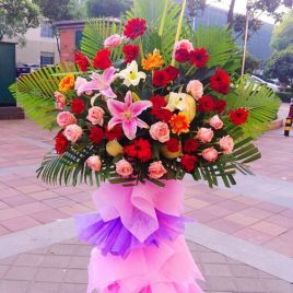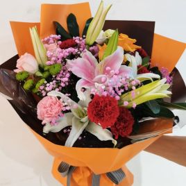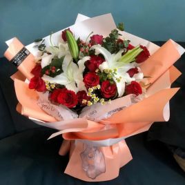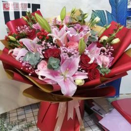 三头白百合1枝,粉玫瑰5枝,红玫瑰10枝,多头玫瑰2枝,小菊,株、、石竹梅,天竺葵绿叶装饰。自营 -