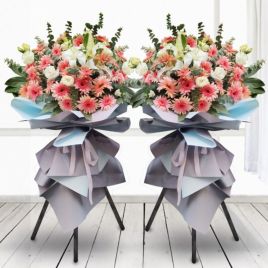 三头粉百合1枝,三头白百合1枝,红色康乃馨5枝,粉康乃馨1枝,粉色玫瑰2枝,辉煌玫瑰2枝,粉色满天星自营 -