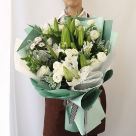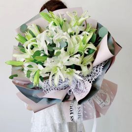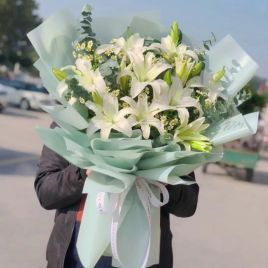 多头白色香水百合3枝,洋桔梗1把,白色玫瑰6枝,尤加利,叶上花,小雏菊搭配。自营 -