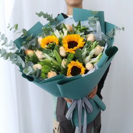 香槟玫瑰6枝,向日葵3枝,三头百合1枝,蓝色绣球1枝,黄金球,尤加利,白色豆搭配。自营 -