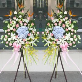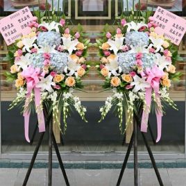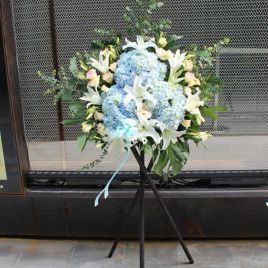 花材:蓝色绣球1枝,白玫瑰6枝,天鹅绒1枝,白色洋桔梗,水仙百合,白色蓝星花,洋甘菊搭配 包装:白色自营 -