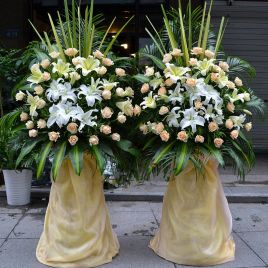 白色三头百合1枝,香槟玫瑰5枝,多头玫瑰2枝,尤加利搭配。自营 -