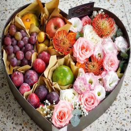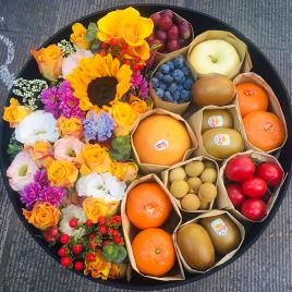 向日葵3枝,香槟玫瑰4枝,多头玫瑰,粉色洋桔梗,尤加利搭配;车厘子,玫瑰葡萄,圣女果,蓝莓,苹果,丰自营 -