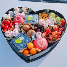 粉玫瑰14枝,白玫瑰1枝,洋甘菊,尤加利搭配;金桔,猕猴桃,草莓,苹果,葡萄,圣女果,蓝莓,桂圆,胡自营 -