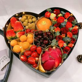 红玫瑰9枝,多头玫瑰,尤加利,小菊搭配;车厘子,火龙果,圣女果,金桔,草莓,桂圆,桔子自营 -