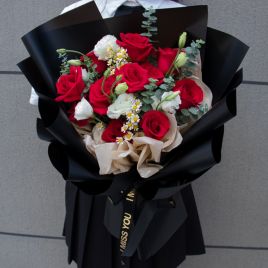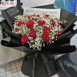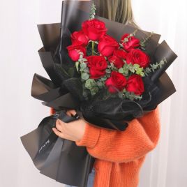 花材:红玫瑰11枝,红豆丰满,尤加利叶搭配 包装:白色雪梨纸内衬,红色欧雅纸扇形包装,黑色字母带蝴蝶自营 -