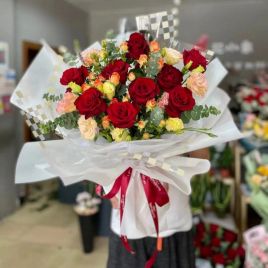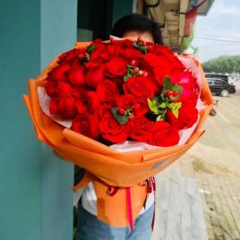 花材:红玫瑰10枝,向日葵2枝,橙色芭比3枝,尤加利叶搭配。 包装:白色内衬,朱红色欧雅纸半单面包装自营 -