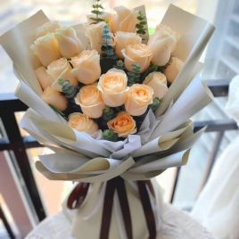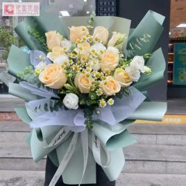 香槟玫瑰、白玫瑰共9枝,白色洋桔梗,尤加利,洋甘菊搭配自营 -