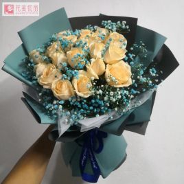 绣球1枝,香槟玫瑰白玫瑰19枝,洋桔梗洋甘菊尤加利搭配,天蓝色精美包装。自营 -