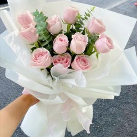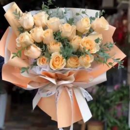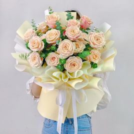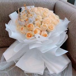 白色三头百合1枝,香槟玫瑰5枝,多头玫瑰2枝,尤加利搭配。自营