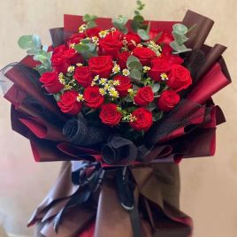 三头白百合1枝,粉玫瑰5枝,红玫瑰10枝,多头玫瑰2枝,小菊,株、、石竹梅,天竺葵绿叶装饰。自营 -