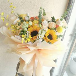 香槟玫瑰6枝,白玫瑰3枝,向日葵3枝,黄色乒乓菊2枝,多头玫瑰2枝,洋甘菊,洋桔梗,跳舞兰,小菊,尤自营 -