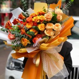 红玫瑰1枝,粉玫瑰3枝,香槟玫瑰2枝,向日葵1枝,白色洋桔梗,小菊,鼠爪搭配。自营 -