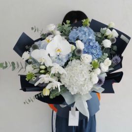 白色绣球1枝,蓝色绣球2枝,白色蝴蝶兰1枝,刺琴,白色洋桔梗,尤加利搭配。自营 -