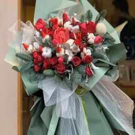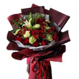 红玫瑰16枝+2枝百合,8枝绿色康乃馨,黄英,红色小雏菊。自营 -