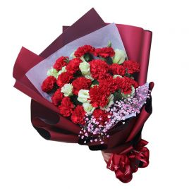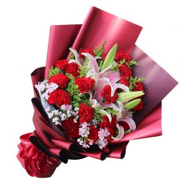 19枝红色康乃馨,2枝多头粉色百合,黄英搭配,相思梅点缀。自营 -