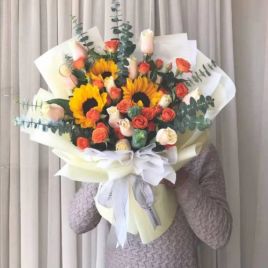 玛利亚玫瑰洋桔梗水仙百合翠菊扶郎尤加利银叶菊花束