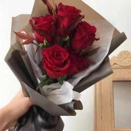 [材料]:19枝戴安娜玫瑰,红色康乃馨5枝,雏菊、黄英、洋桔梗搭配。 [包装]:咖啡色雾面纸圆形精自营 -