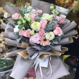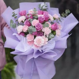 [材料]:11枝戴安娜玫瑰,多头康乃馨,洋桔梗,石竹梅搭配。 [包装]:乳白色,粉色卡纸半单面包装自营 -