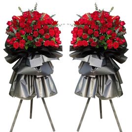 [材料]:大红玫瑰50枝,红掌2片,尤加利叶,栀子叶。 [包装]:木质三脚架,灰色雾面纸包装,精美制自营 -